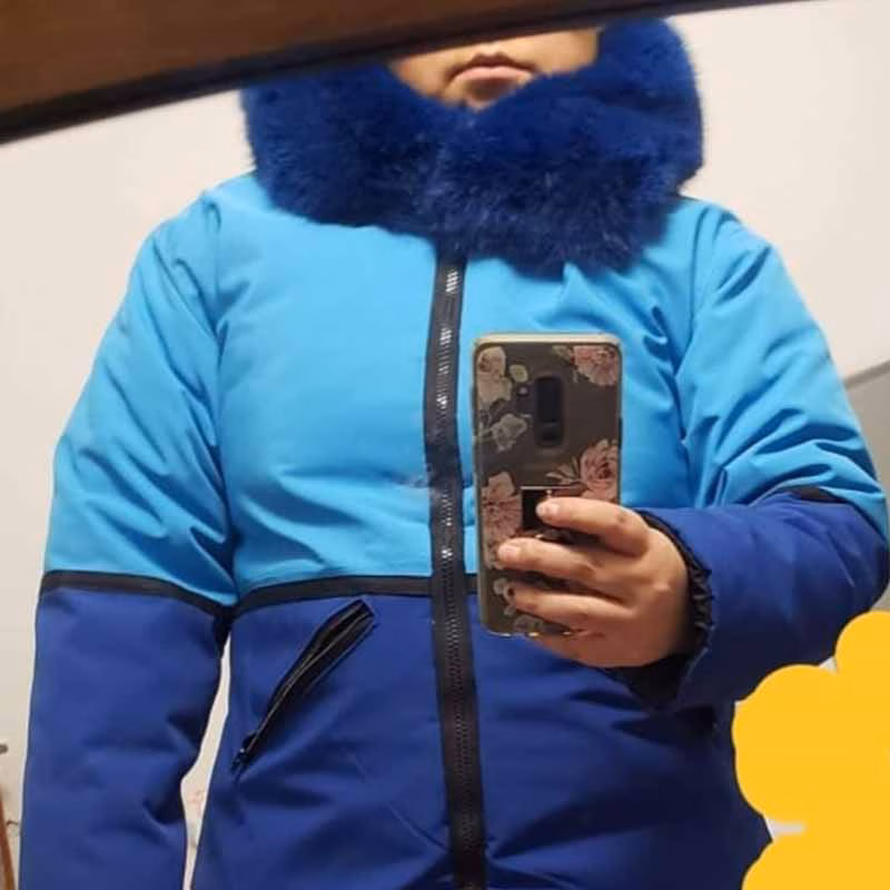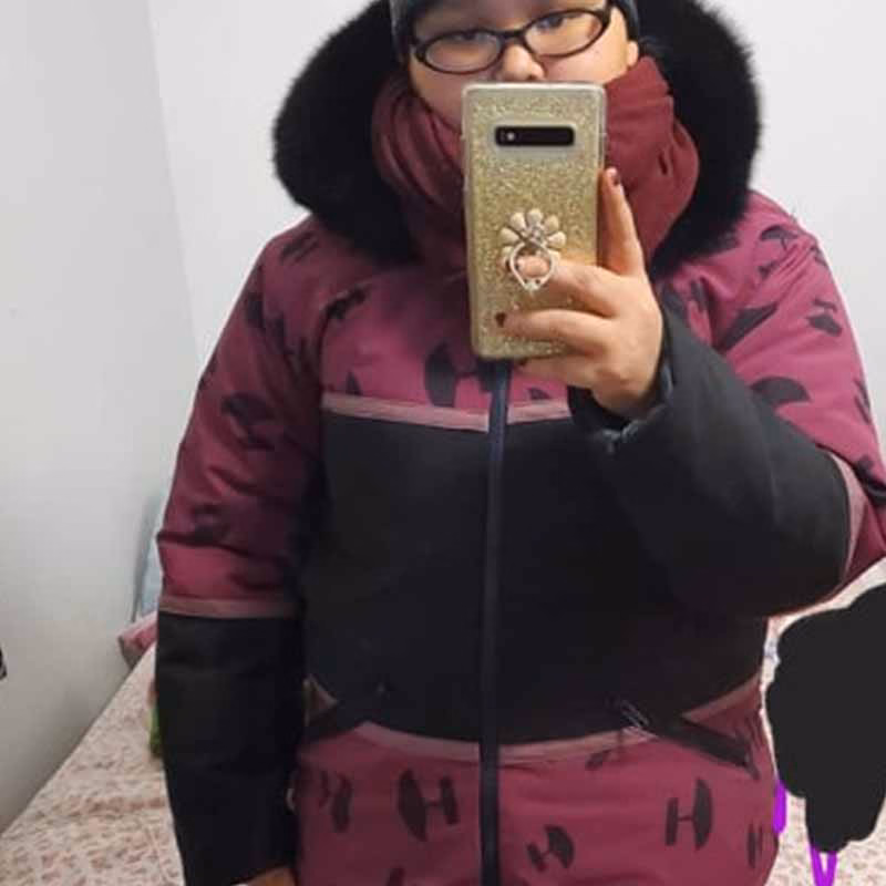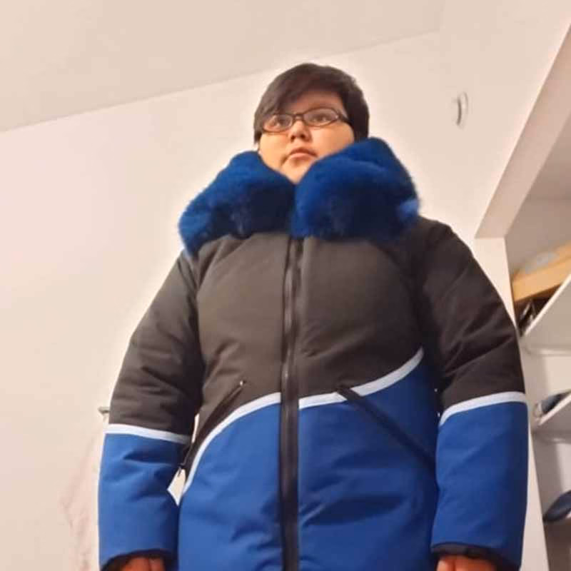 Angie grew up in the community of Clyde River. Her mother is a creative and efficient sewer who taught her basic sewing beginning about four years ago. She now makes her own parkas and snow pants. Angie started making her own parkas because she is fussy about what she likes to wear during winter. She is a young talented seamstress today and loves to design her own outerwear. She loves to work with cloth and sealskins. Angie gets a lot of compliments from her parkas and many people request custom orders from her for parkas and snow pants but she prefers to make them for herself at the moment.