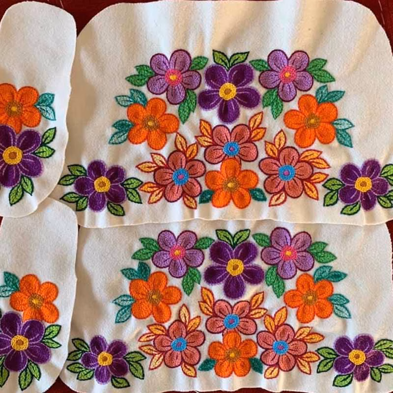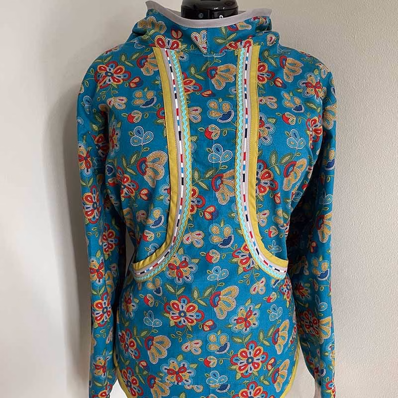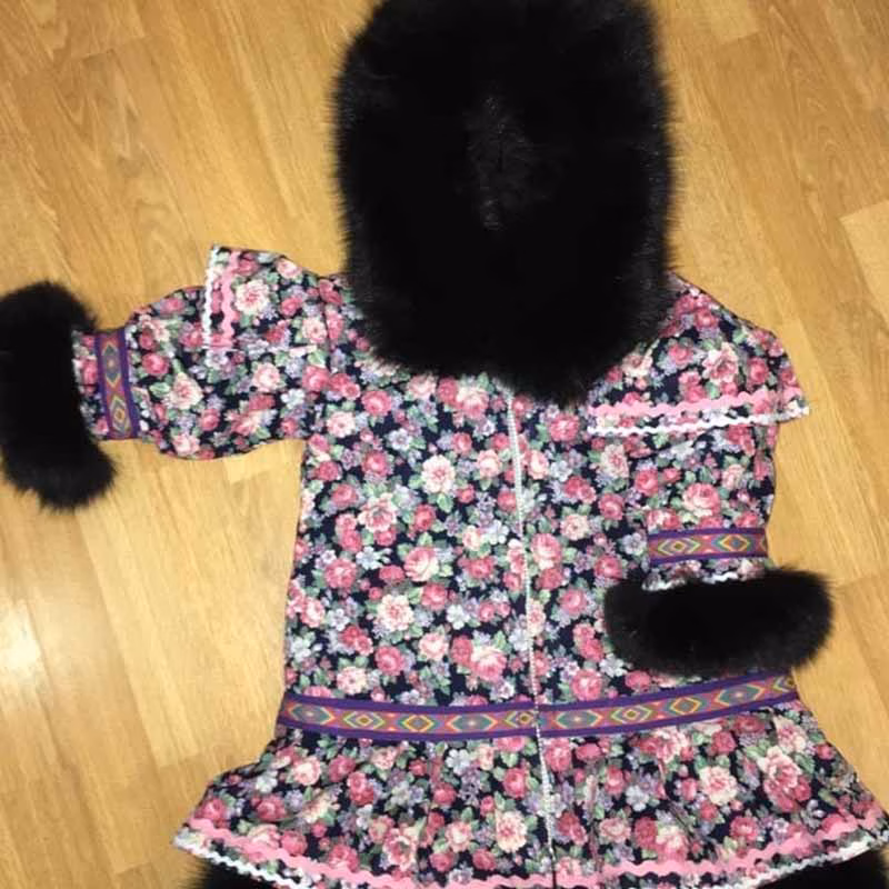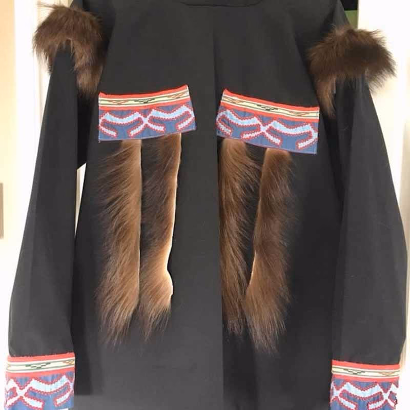 Artist’s background: Clara grew up in Cambridge Bay, her mother taught her how to sew traditional clothing when she was young. In order to buy something for herself back then she would make wall hangings and little owls made from sealskin and sell them. Sewing is a big stress reliever and Clara has done a lot of healing through sewing over the past years. Clara now designs her own parkas and makes traditional drum outfits with wolf fur and does beautful embroidery by hand. She is now retired from Government of Nunavut and teaches contemporary sewing for her daughter’s sewing group.